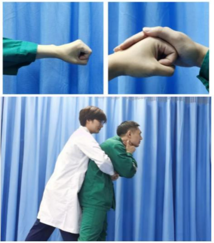 1.站在孩子背后,双手放于孩子肚脐与胸骨间,一手握拳,另一手包住拳头;