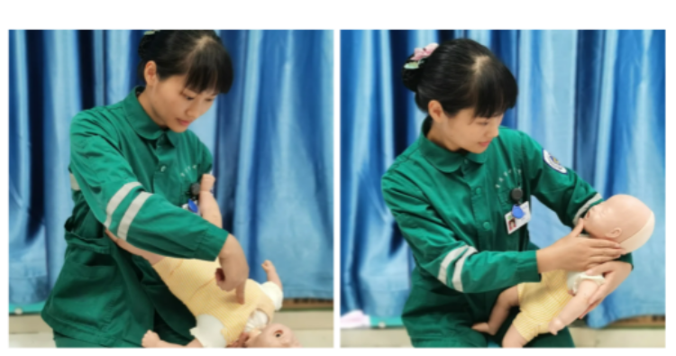 1.救护人员将婴儿的身体置于一侧的臂上,同时手掌将后头颈部固定,头部低于躯干;