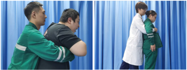 1.救护人员两脚前后站立在窒息者的背后,双臂环绕窒息者的腰部,令窒息者弯腰,头部前倾;