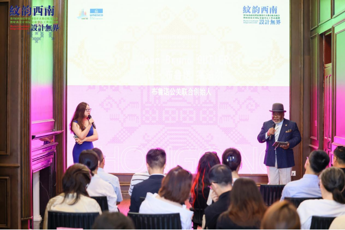 作为主办方代表重庆市服装设计师协会主席梁明玉致辞,布鲁诺公关公司联合创始人法籍嘉宾让·布鲁诺·高迪尔介绍了其推动川渝两地与法国交流成果,以及即将启动的国际设计交流中心会客厅工作站的设想,渝中区商务委副主任朱玲艳女士作为协办单位代表对活动及工作站揭牌仪式表示祝贺,大赛组委会代表重庆市服装设计师协会秘书长王建娜进行了西南纹样项目推荐,西南纹样原创设计大赛的总策划四川美术学院牟群教授分享了西南可挖掘的纹样素材和文化要素。