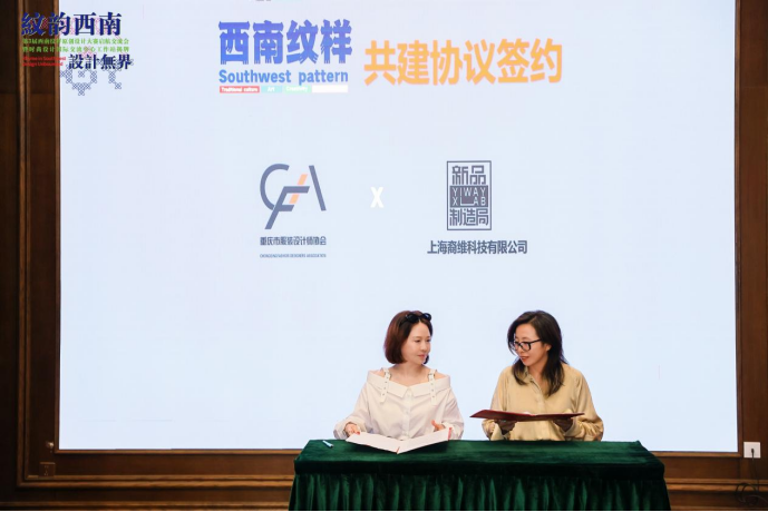 最后西南纹样组委会代表重庆市服装设计师协会副主席江华女士与大赛共建方上海裔维科技有限公司总经理张巍签订战略协议,未来共同推进西南纹样的时尚产业转化!
