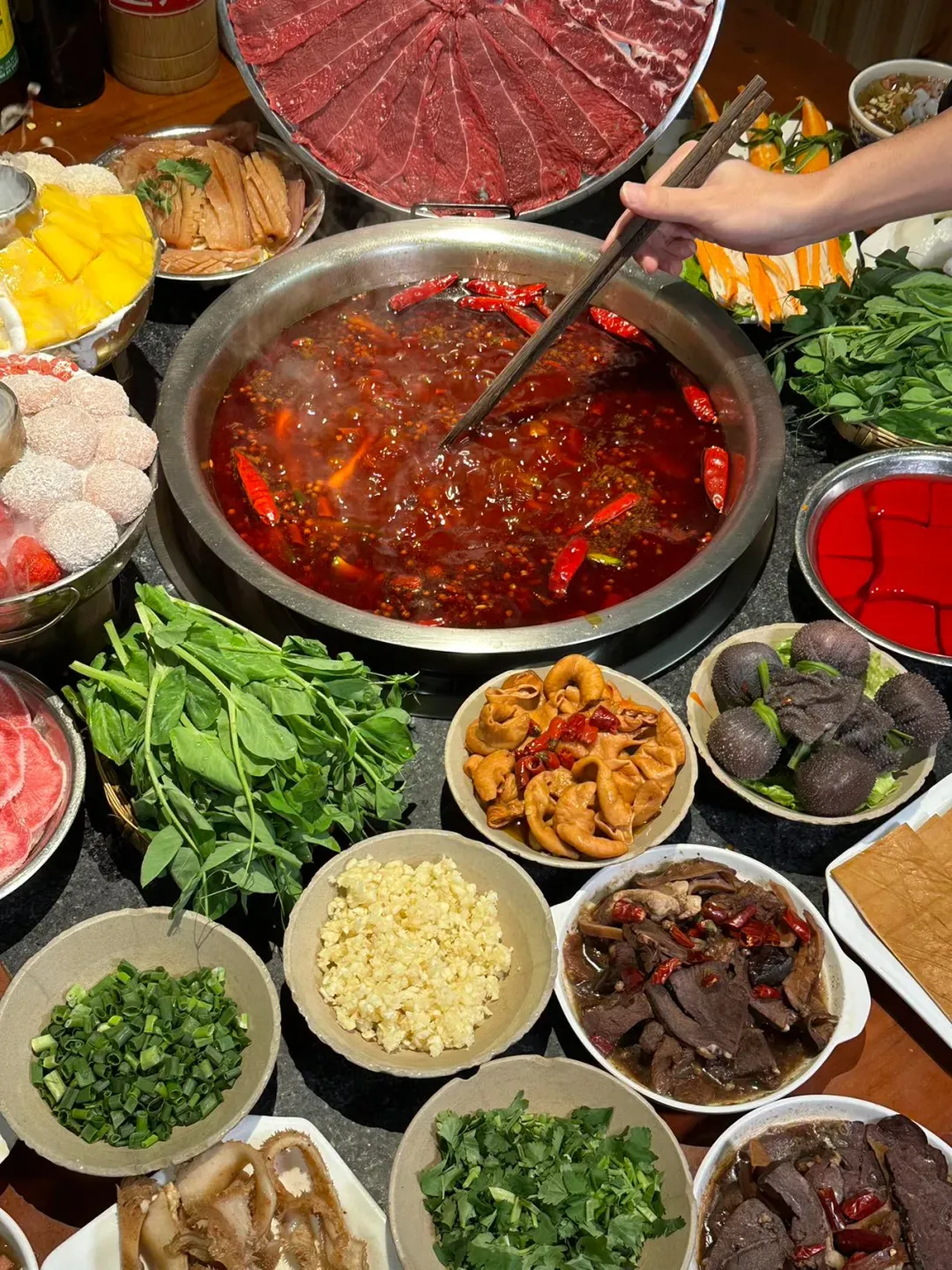 不仅本地人多,众多游客也“寻味而至”。老火锅底醇厚鲜香,大块大块的脸盆牛肉,口感丰富的毛肚包虾滑……甜品也很有特色,草莓麻薯小火锅,上面是新鲜草莓、奶盖和麻薯,下面是牛乳冰,解辣又解腻。