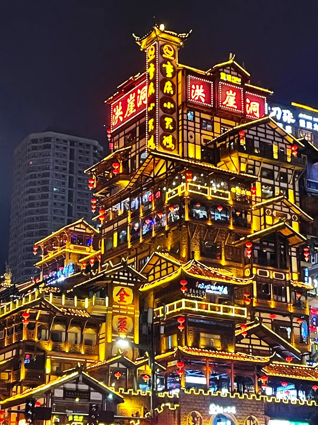 洪崖洞是重庆旅游标志性景点,也是被中外媒体誉为可与日本动漫电影《千与千寻》场景媲美的“天空之城”。依山就势、沿江而建的吊脚楼群,夜晚灯光璀璨,壮观夜景火遍世界。