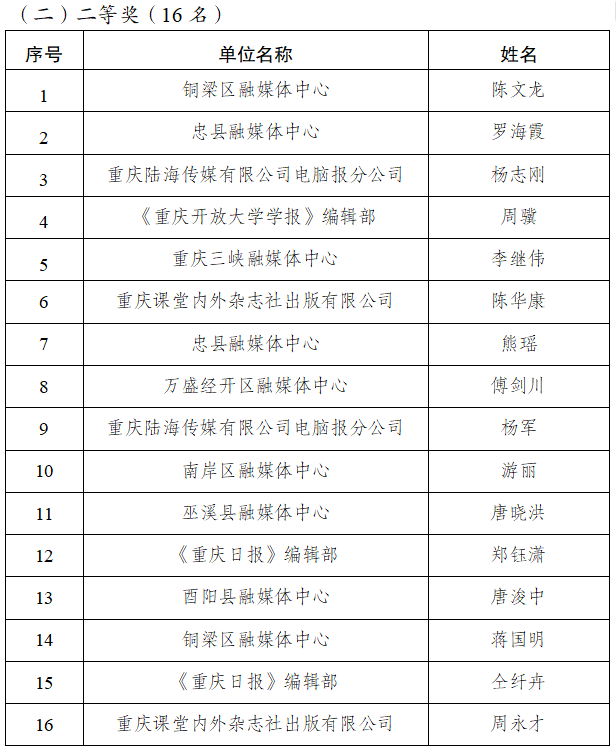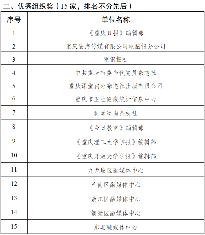 为激励先进,树立榜样,市新闻出版局决定对比赛成绩突出的个人及单位予以表扬并颁发荣誉证书(详见附件)。同时,获奖选手可视为当年完成30学时继续教育。来自我市公开发行的报刊出版单位(集团)的个人成绩前3名选手拟代表重庆参加全国决赛团体赛,个人成绩前10名选手参加全国决赛个人赛。希望受表扬的单位和个人再接再厉,再创佳绩。