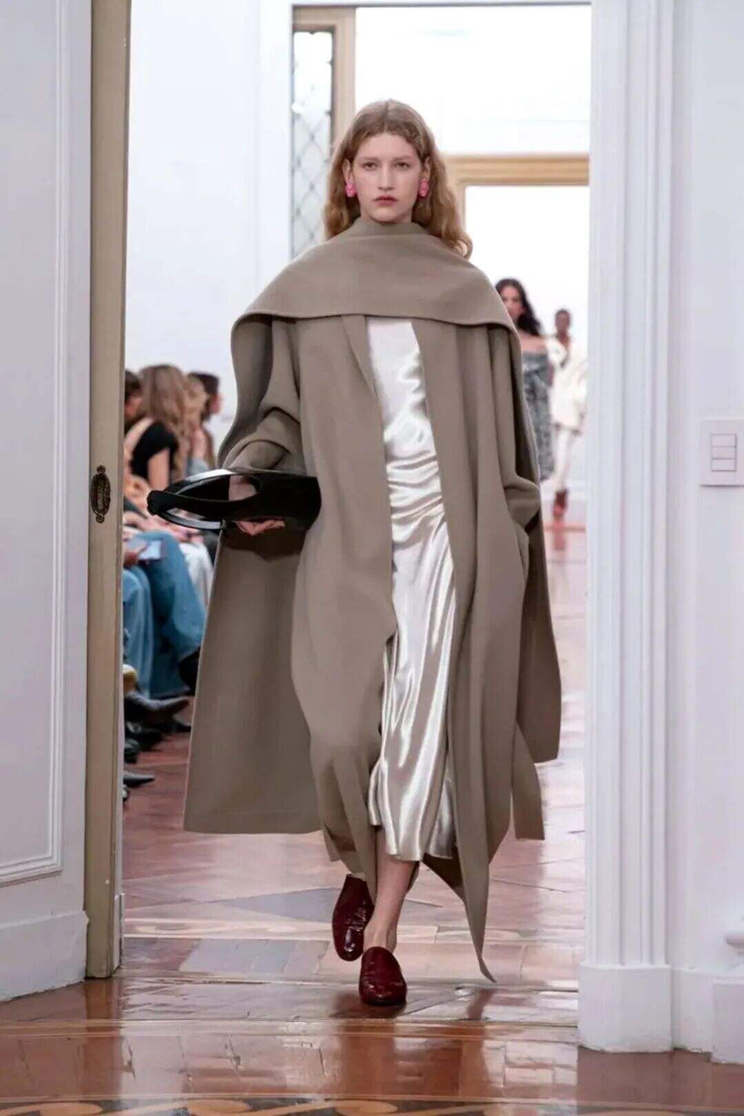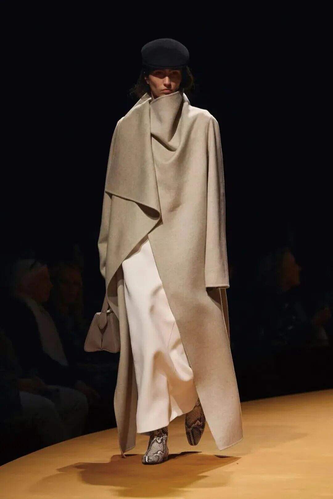 主要结构在于领口的线条、褶皱、围裹设计增添动态效果。它的优势在于无须复杂搭配,一件深灰羊毛高领大衣配阔腿裤即可优雅出街。