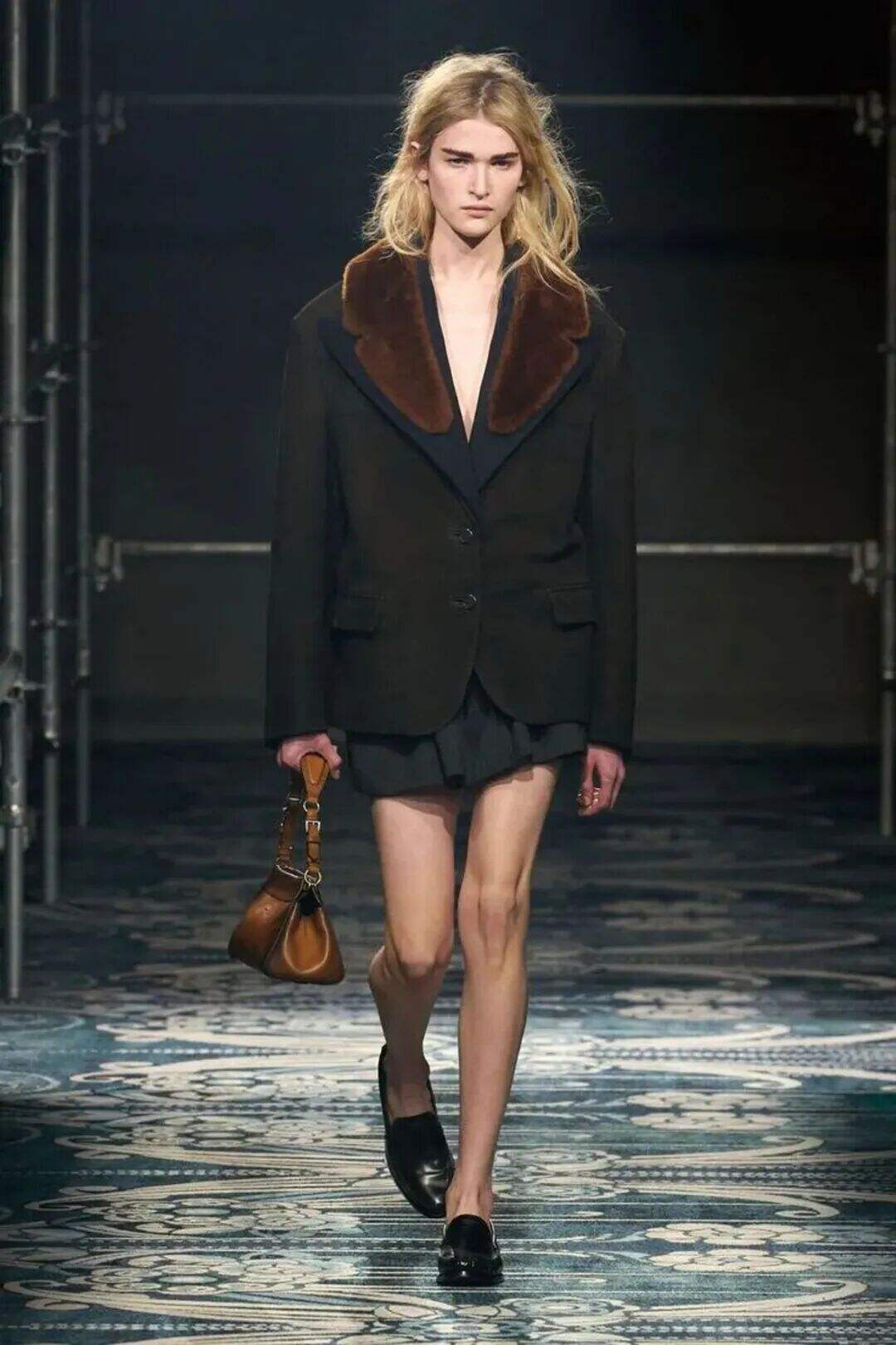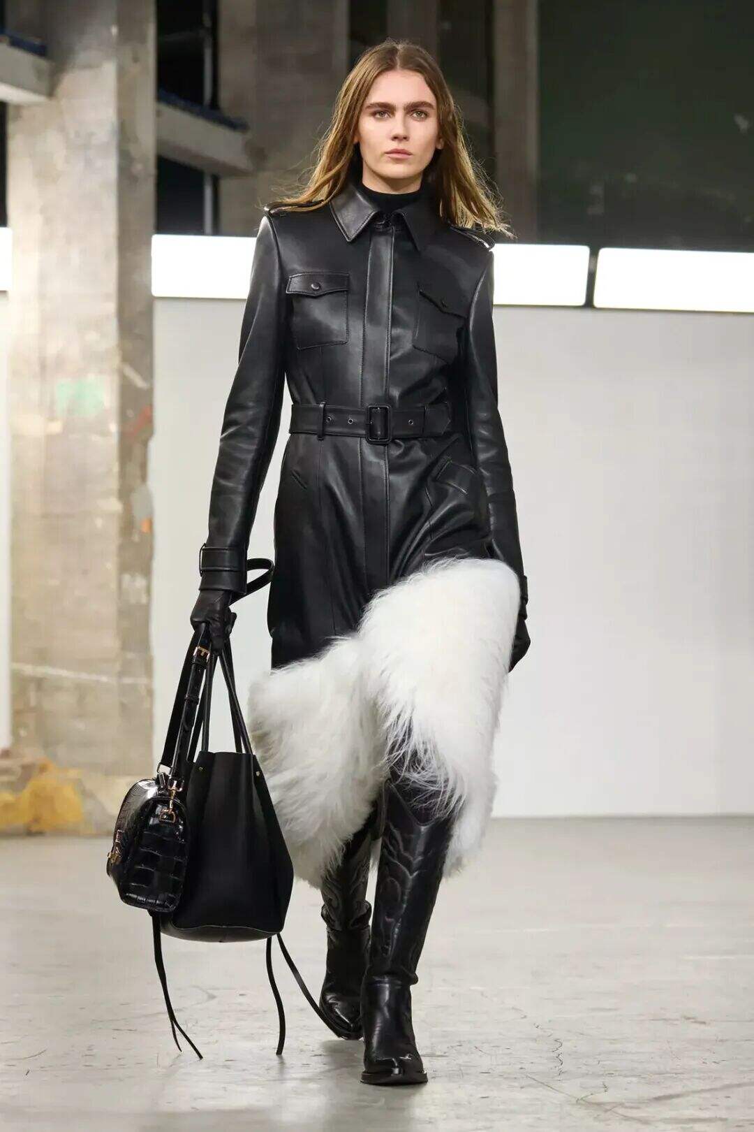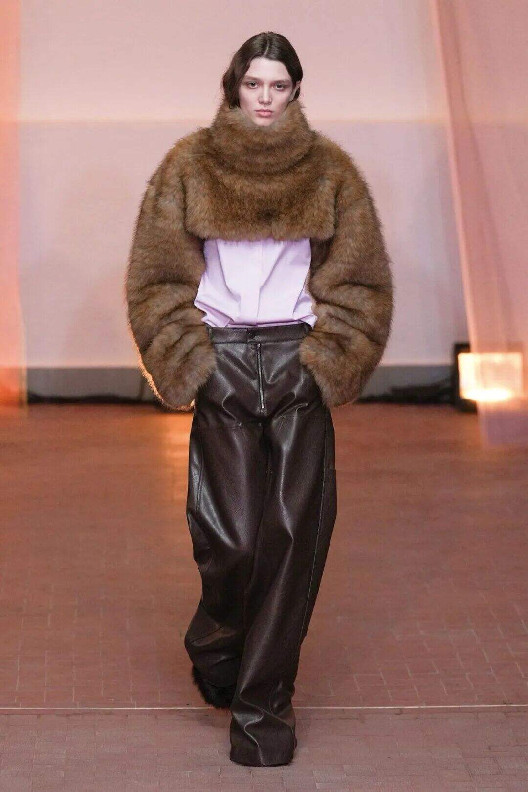 值得注意的是,本季的皮草边饰常与异材质结合,例如皮革与皮草的拼接、印花面料上的毛绒饰边,这种混搭让皮草少了厚重感,多了年轻与俏皮的意味,也能让你在硬朗与柔软之间找到平衡。