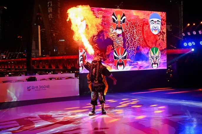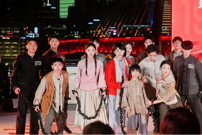“夜演”演绎了古今对话的文艺盛宴。无人机表演虚实交融,川剧京剧韵味悠长,舞台剧、音乐会与山水实景演出各具风情,铜梁龙舞尽显恢弘,文艺气息在夜色中流淌。现场展示的大型红色历史舞台剧《重庆1949》精彩片断、川剧变脸喷火表演等,让观众连声赞叹。