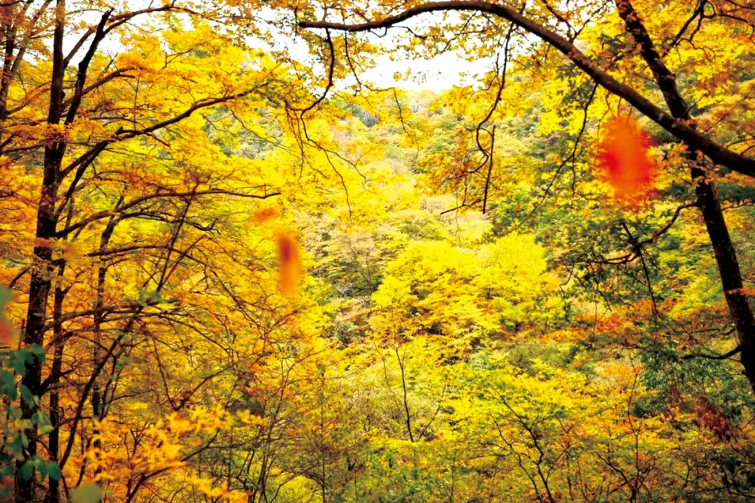 叶片红黄交织,将山林渲染成极具层次感的“油画”。气候宜人的时节,坐上高铁,趁着红叶娇艳,赶紧出发!