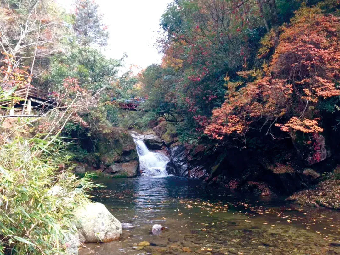 十八月潭景区,以“瀑潭映红叶”为特色,18个月牙形潭水倒映着两岸枫香、黄栌,形成了如诗如画的美景。步道平缓,适合老人和小孩游玩,可以从中坝停车场乘摆渡车直接到山顶,然后沿木栈道徒步下山,欣赏瀑潭相连的美景,这里的红叶变色比大坝景区来得晚一点。