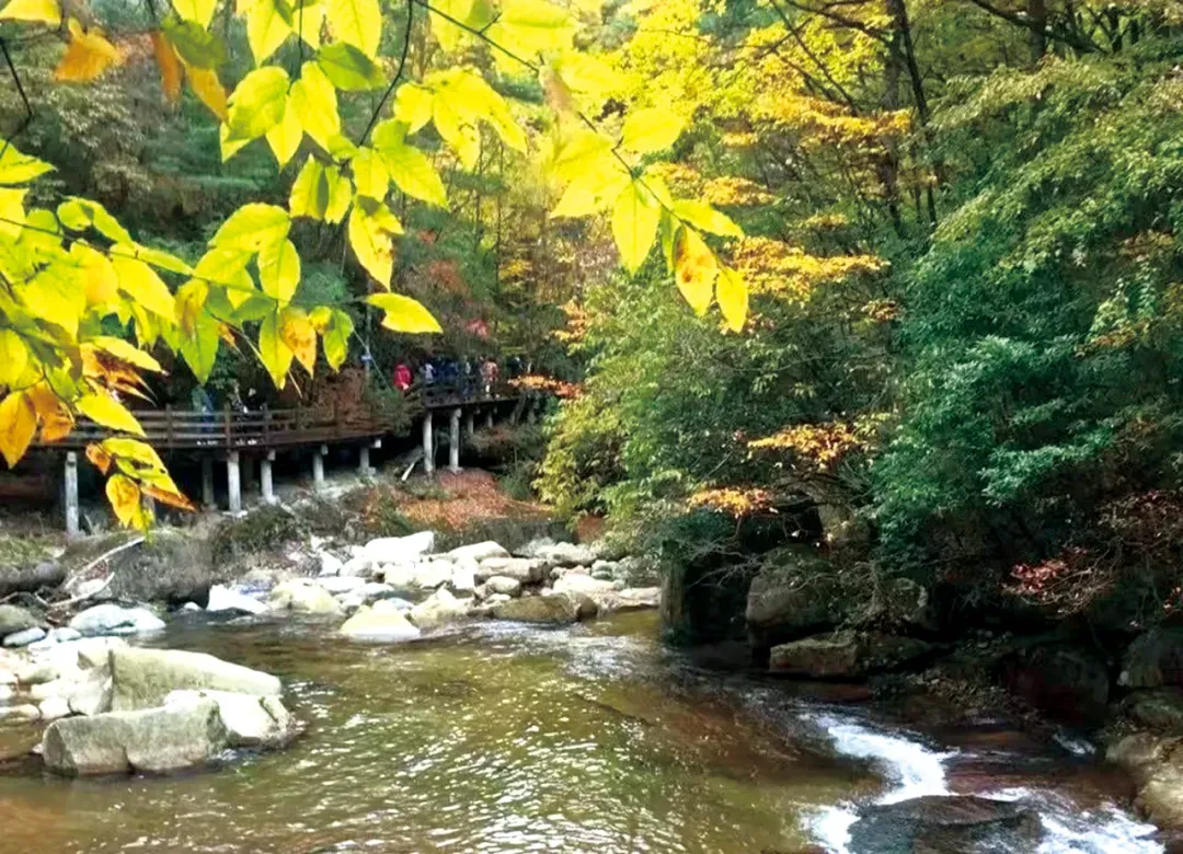 这是看红叶的精华区域,也是红叶节期间人最多的热门点,有“天然画廊—大小兰沟—黑熊沟—香炉山”经典动线。可以乘景区交通车漫游红叶长廊,欣赏红黄交织的彩林;也可以沿溪流栈道近距离观赏红叶,感受其与溪流相互映衬的美景。