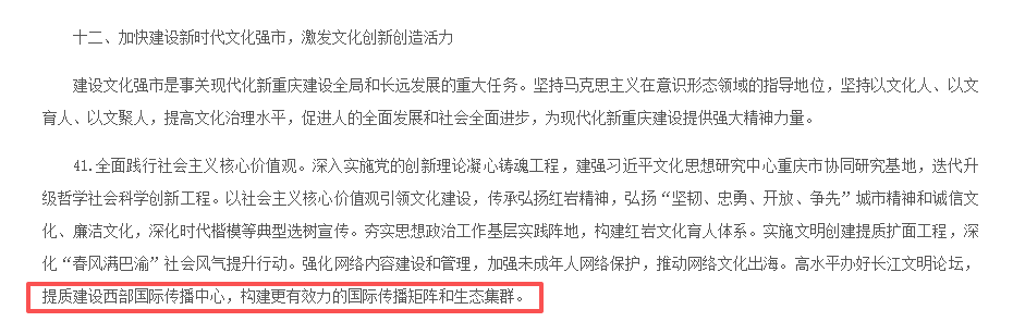 图:“提质建设西部国际传播中心,构建更有效力的国际传播矩阵和生态集群”写入重庆市“十五五”规划建议