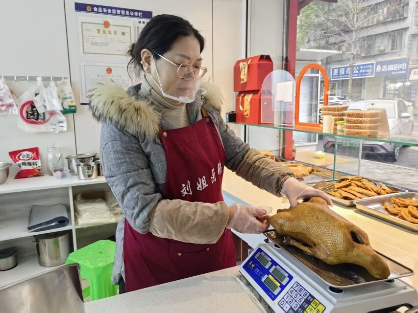 ▲刘敏正在给卤鹅称重。记者 罗芸 摄
