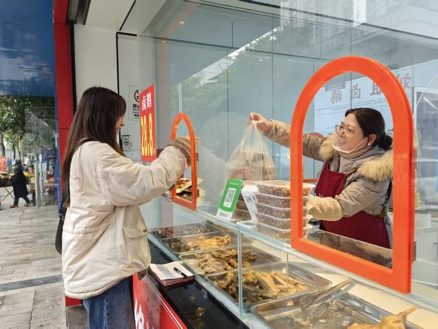 ▲刘敏(右)将打包好的卤鹅递给顾客。记者 罗芸 摄