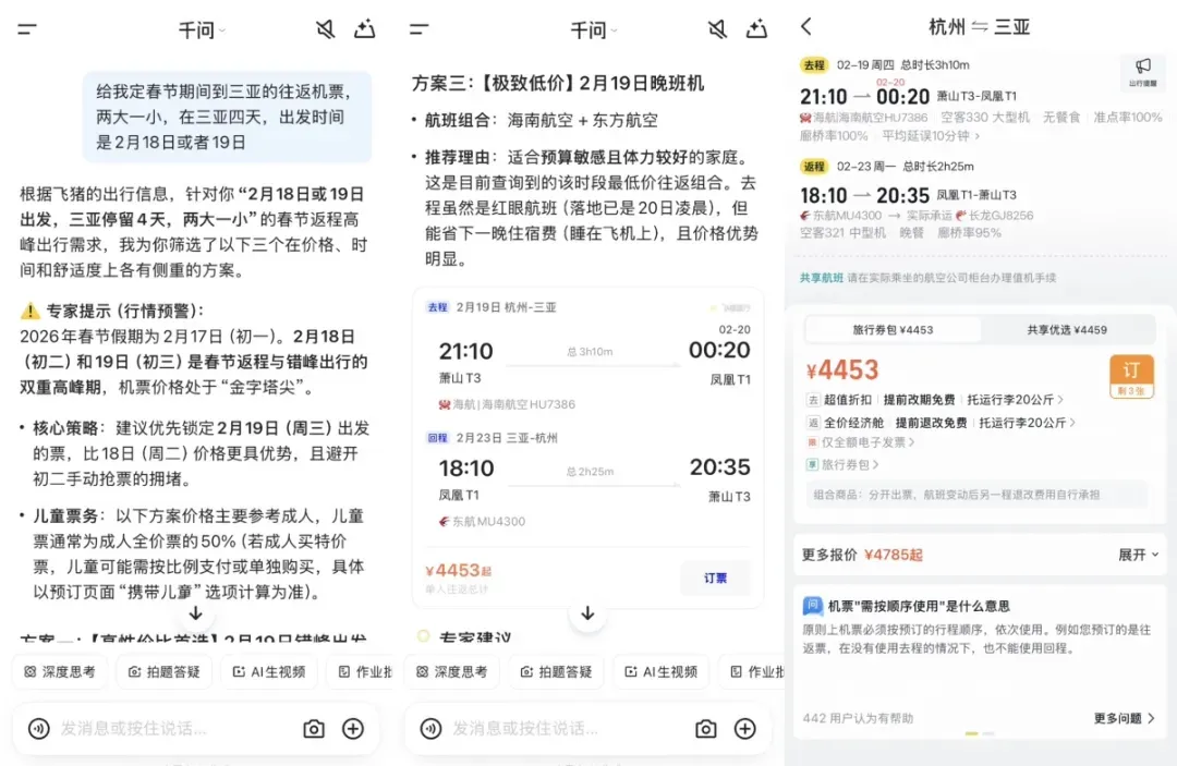 此外,千问App展现了强大的跨应用协同能力。在春节出游场景中,千问App可以调用飞猪能力完成机票酒店的预定,可以调用高德的能力完成行程规划、年夜饭的预定。甚至,千问App还能直接帮用户打电话订餐厅。