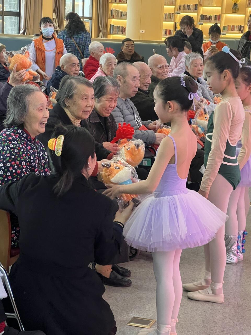 舞台之上,孩子们踮起足尖,将平日里反复打磨的芭蕾舞蹈倾情呈现:轻盈的跳跃、舒展的手臂、专注的眼神,每一个动作都承载着童真与敬意;舞台之下,她们化身贴心小使者,将提前准备好的羊毛帽子、柔软围巾亲手送到爷爷奶奶手中,指尖传递的温度,比冬日暖阳更治愈。老人们的脸上漾起笑意,有的跟着节奏轻轻拍手,有的悄悄擦拭眼角的湿润,岁月的距离在这一刻被爱意悄然消融。