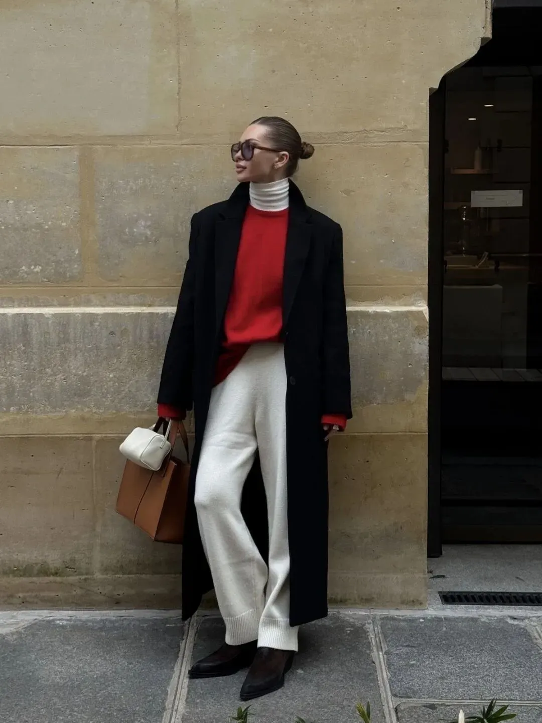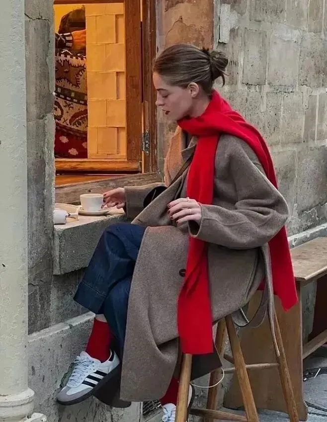 软软糯糯贴身穿,像裹了一团带着阳光的红绒球,从大衣领口露出的一抹红,既衬得肤色透亮,又不会过分张扬,这种“由内而外”的色彩流露显得格外高级。走在拜年的路上,风都是暖的,这才是新年该有的温柔与热闹呀。