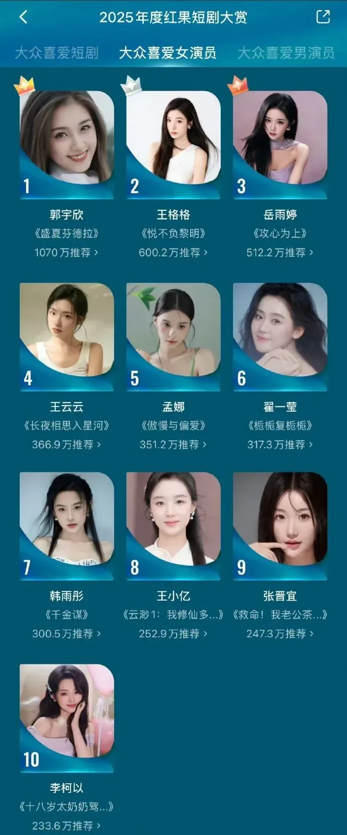 一反其他影视投票中男明星票数整体碾压女星的表演,在2025红果年度大赏中,郭宇欣,1070万票,断层登顶。票数超过男星榜一,超女星第二名470万,接近第二到第五名票数总和。