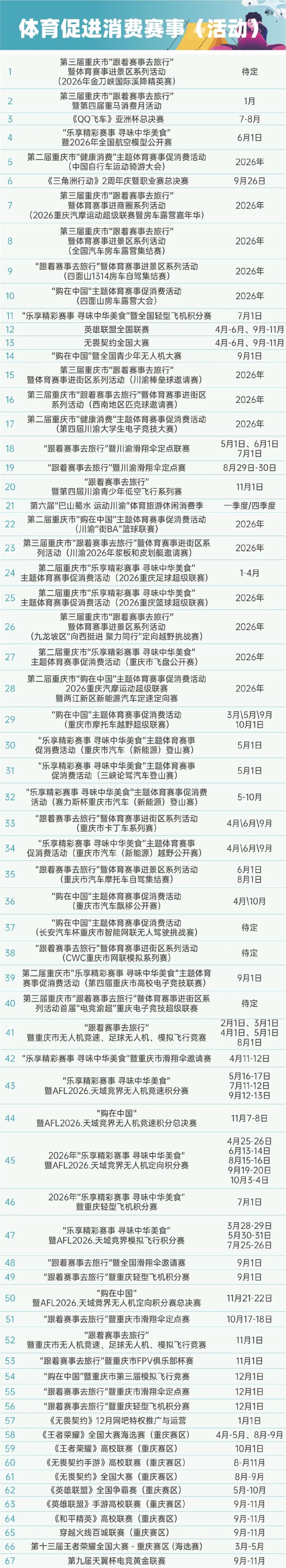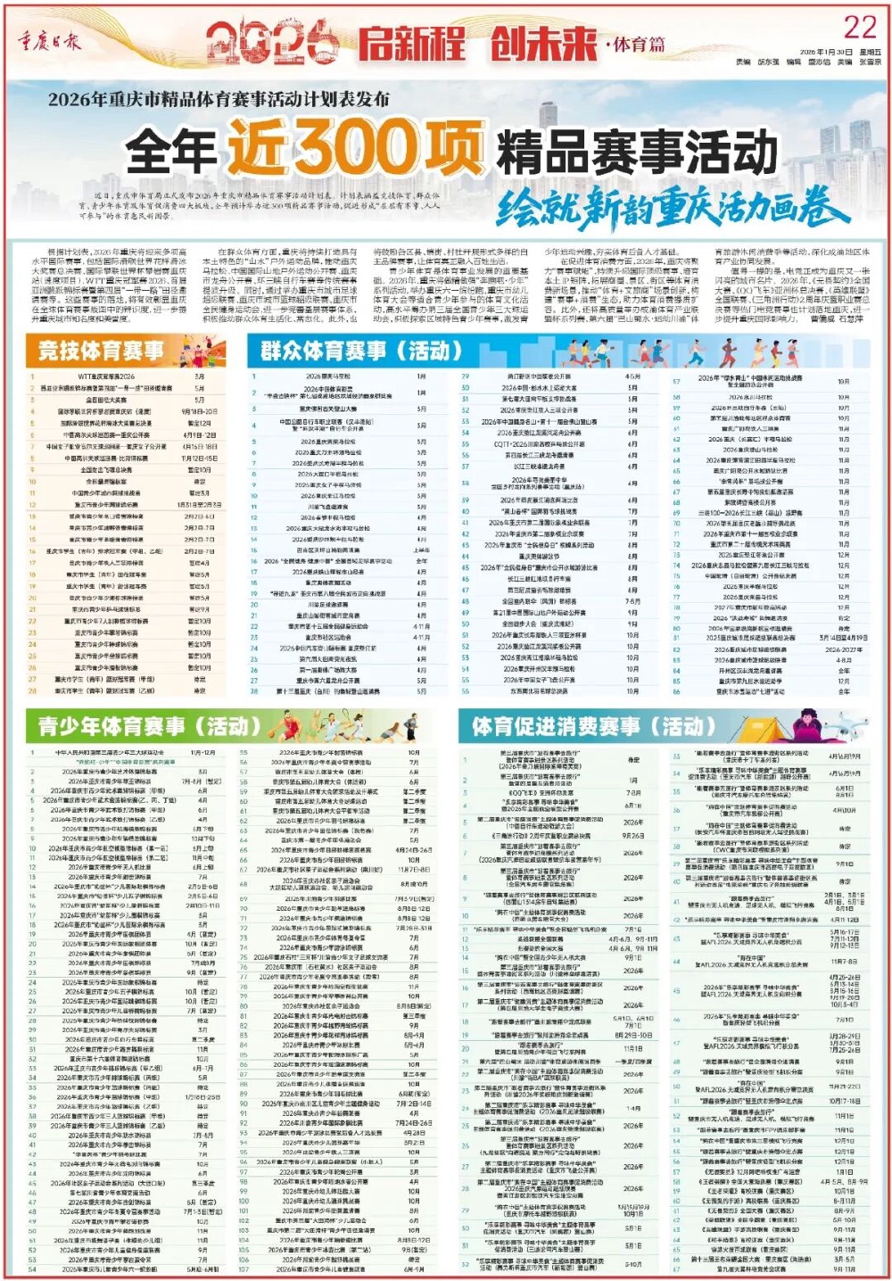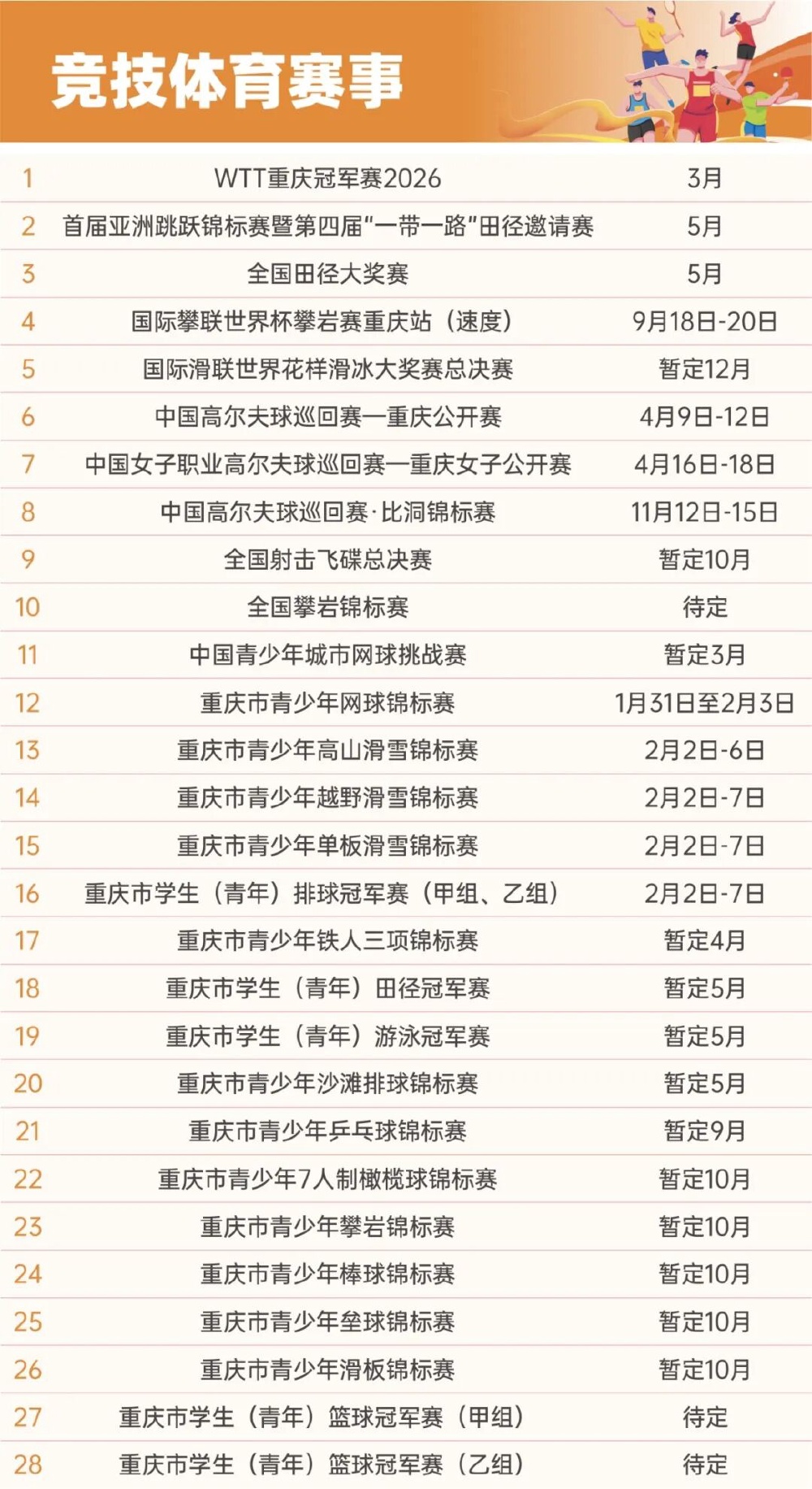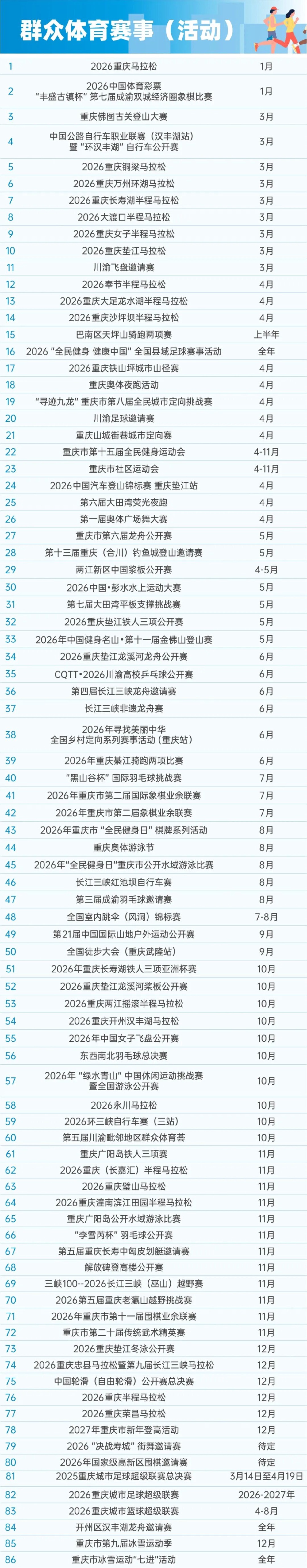 近日,重庆市体育局正式发布2026年重庆市精品体育赛事活动计划表。计划表涵盖竞技体育、群众体育、青少年体育及体育促消费四大板块,全年预计举办近300项精品赛事活动,促进形成“层层有赛事、人人可参与”的体育惠民新图景。