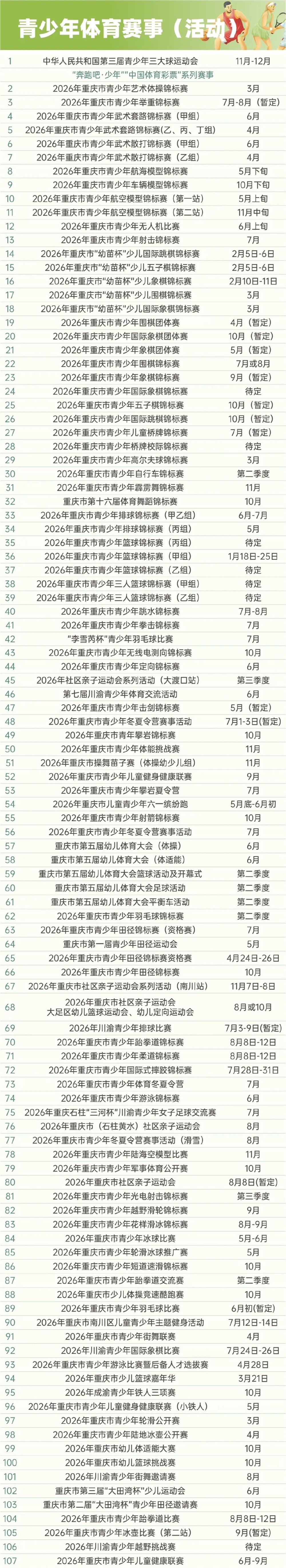 青少年体育是体育事业发展的重要基础。2026年,重庆将做精做强“奔跑吧·少年”系列活动,举办重庆六一缤纷跑、重庆市幼儿体育大会等适合青少年参与的体育文化活动,高水平筹办第三届全国青少年三大球运动会,积极探索区域特色青少年体育赛事,激发青少年运动兴趣,夯实体育后备人才基础。