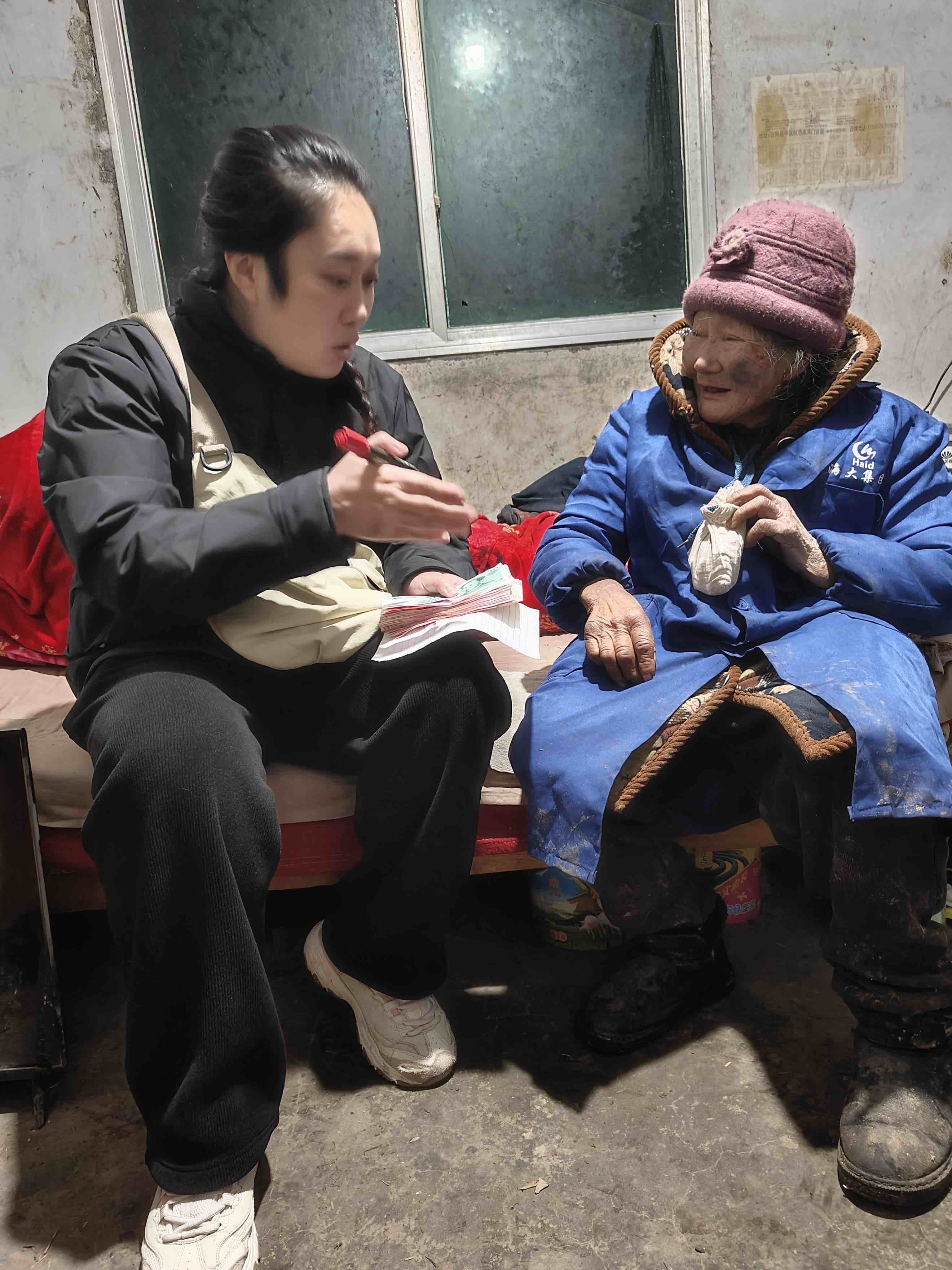 ▲李洋将卖猪的钱送到张婆婆手中。受访者供图