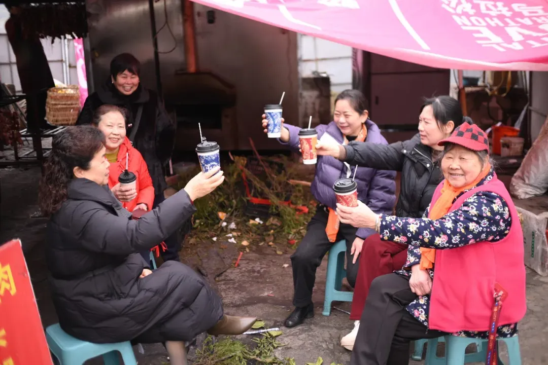 ▲坐等熏香肠腊肉的孃孃喝上了免费奶茶。