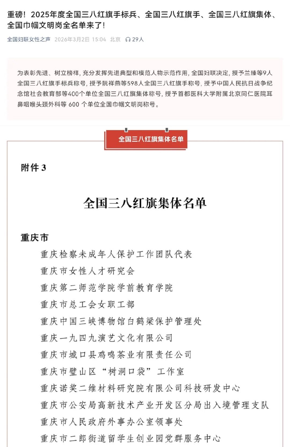 春风送暖,喜讯传来!在刚刚公布的2025年度全国三八红旗集体名单中,重庆市女性人才研究会榜上有名,被全国妇联授予“全国三八红旗集体”荣誉称号!