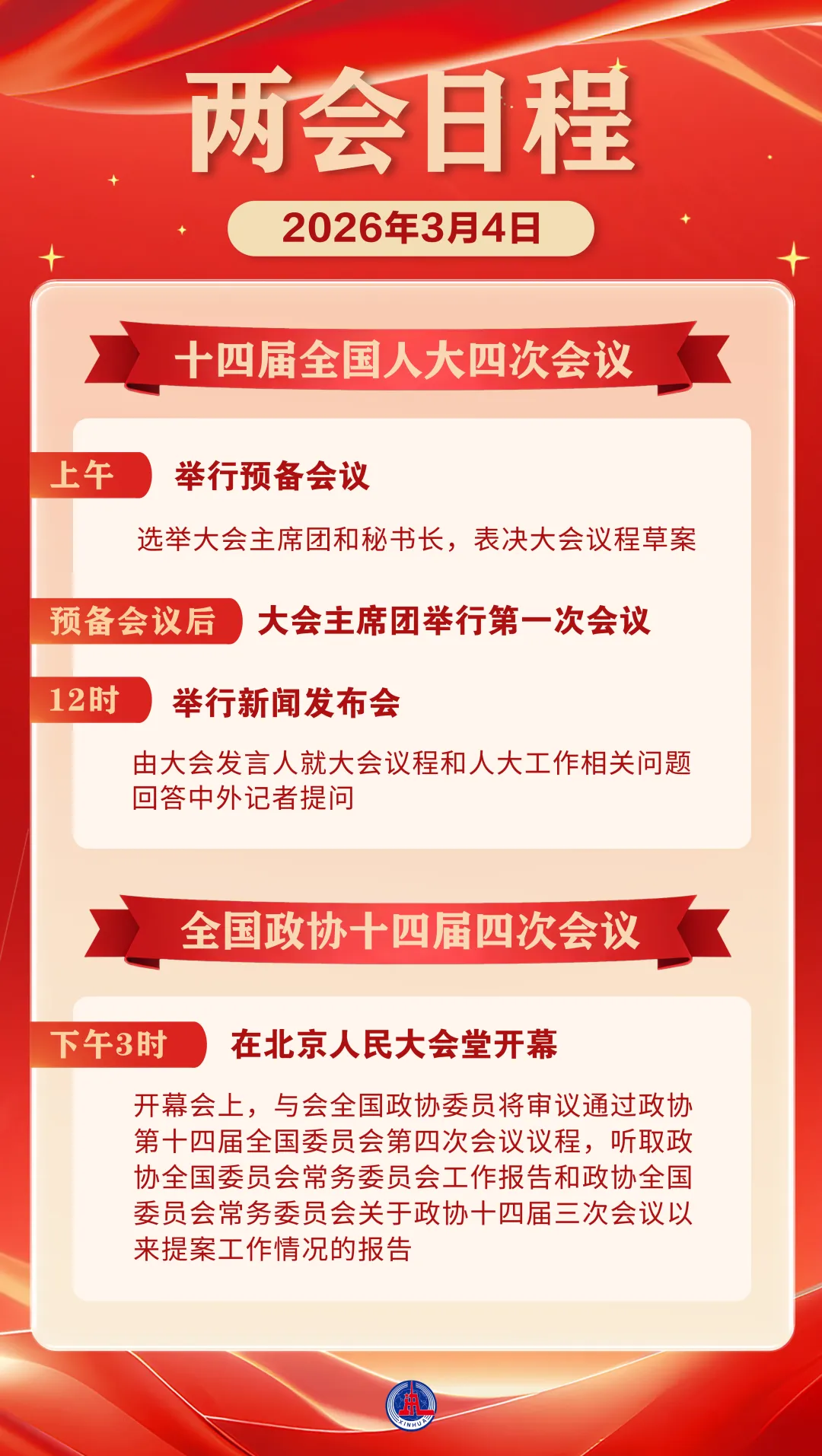 4日上午,十四届全国人大四次会议将举行预备会议,选举大会主席团和秘书长,表决大会议程草案。预备会议后,大会主席团举行第一次会议。12时,十四届全国人大四次会议将举行新闻发布会,由大会发言人就大会议程和人大工作相关问题回答中外记者提问。