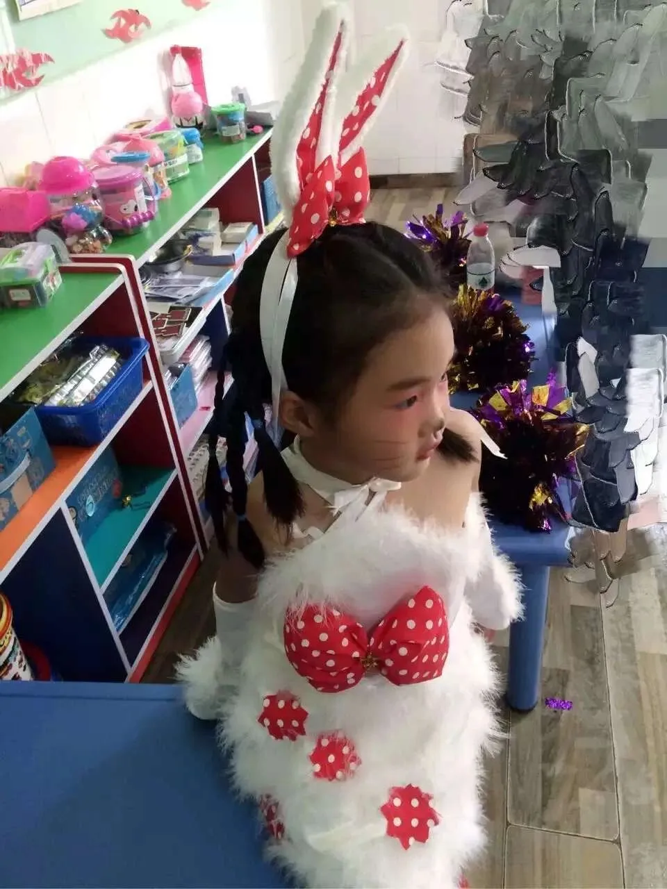 可乐从小就是一个“纯爷们”的性格,对妈妈的化妆品、香水完全是避而远之,感觉沾上似乎就会变成小女生。这两张在幼儿园“六一”表演时的照片,很难想象他当时怎么就接受了这样的“浓妆艳抹”,这服装、这妆容简直就是小时候的表演标配,待到现在来看,也是看一次笑一次。