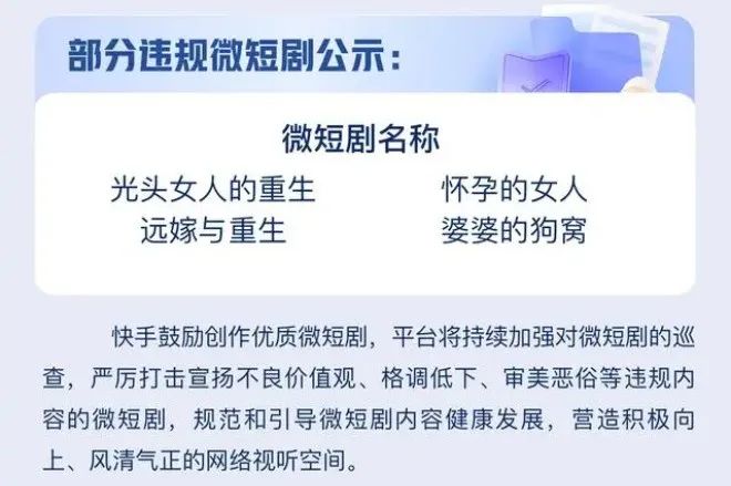 4月10日,快手平台发布公告,下架了《怀孕的女人》《婆婆的狗窝》《远嫁与重生》等4部违规微短剧,并清理相关内容738条。