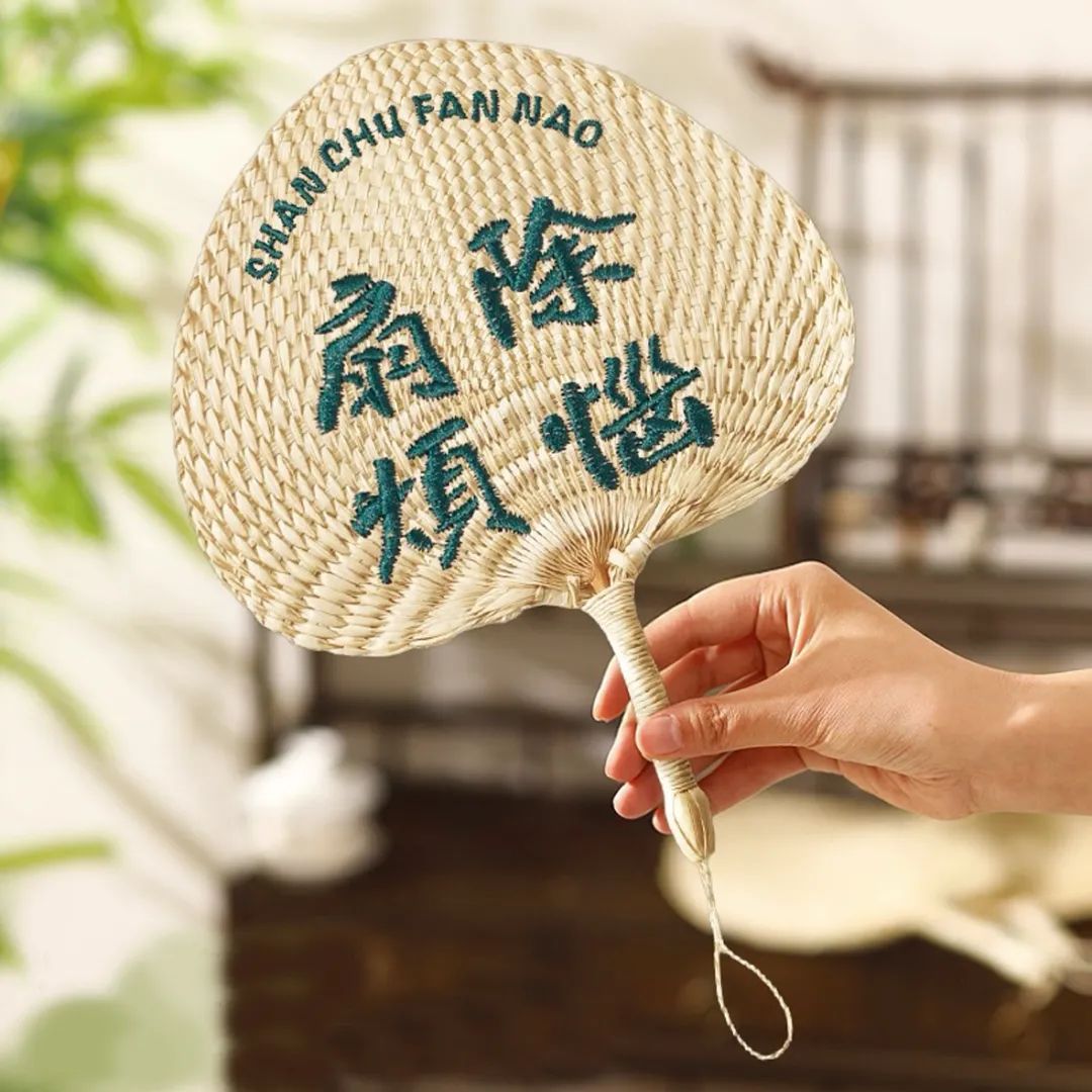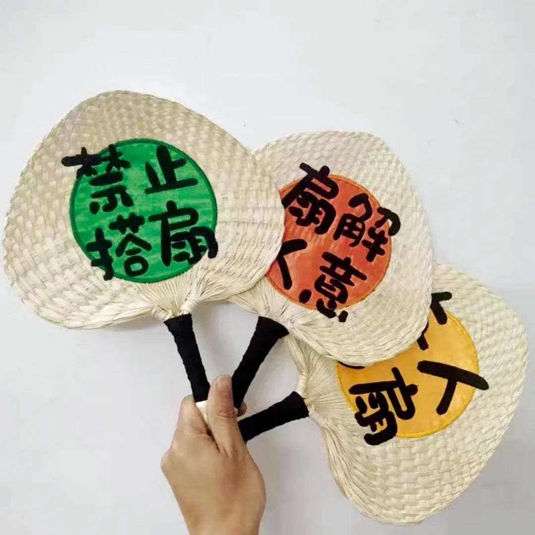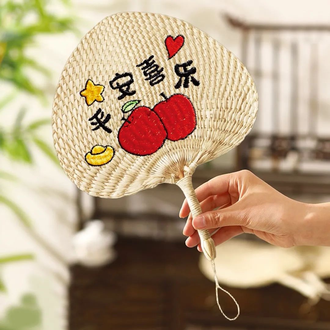 儿时家家必备的普通蒲扇,如今成了一把把可爱的纳凉扇子,扇面上带有祝福或用“谐音梗”的语言装饰,增添很多乐趣和时髦感。