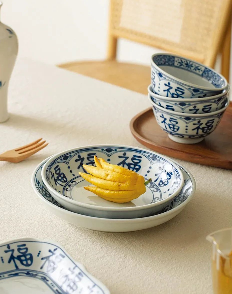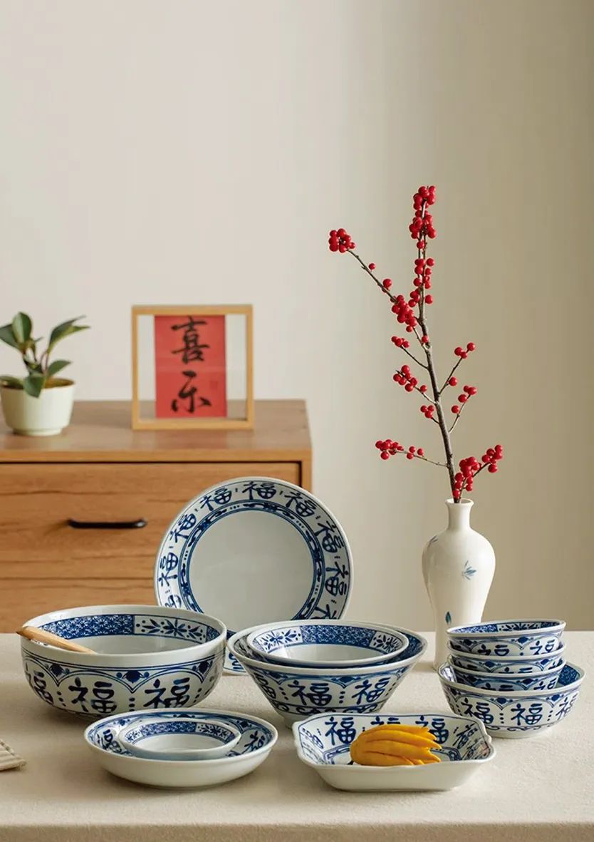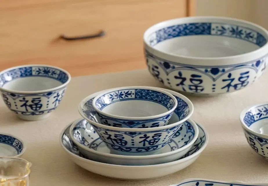 青花瓷餐具富有东方传统文化色彩,以“福”字为主题,寓意美好,兼具实用性和颜值,其风格与新中式装修最配。