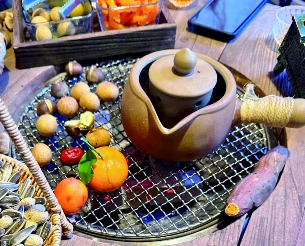 选一个向阳的位子坐下,橙红茶汤在阳光下泛起琥珀光,看光斑在桌面轻轻跳跃,在小炉子上慢烤万物。看甘蔗表皮渐渐收紧,渗出甜蜜的汁液;丢几颗板栗进去,不多时便会“啪”地绽开,露出金黄糯香的栗肉;红薯的焦香与红枣的甜香渐渐交融……这“烤”的过程本身,就是一种缓慢的、充满期待感的仪式,热热闹闹、丰饶富足,便是山城冬天的治愈时刻。