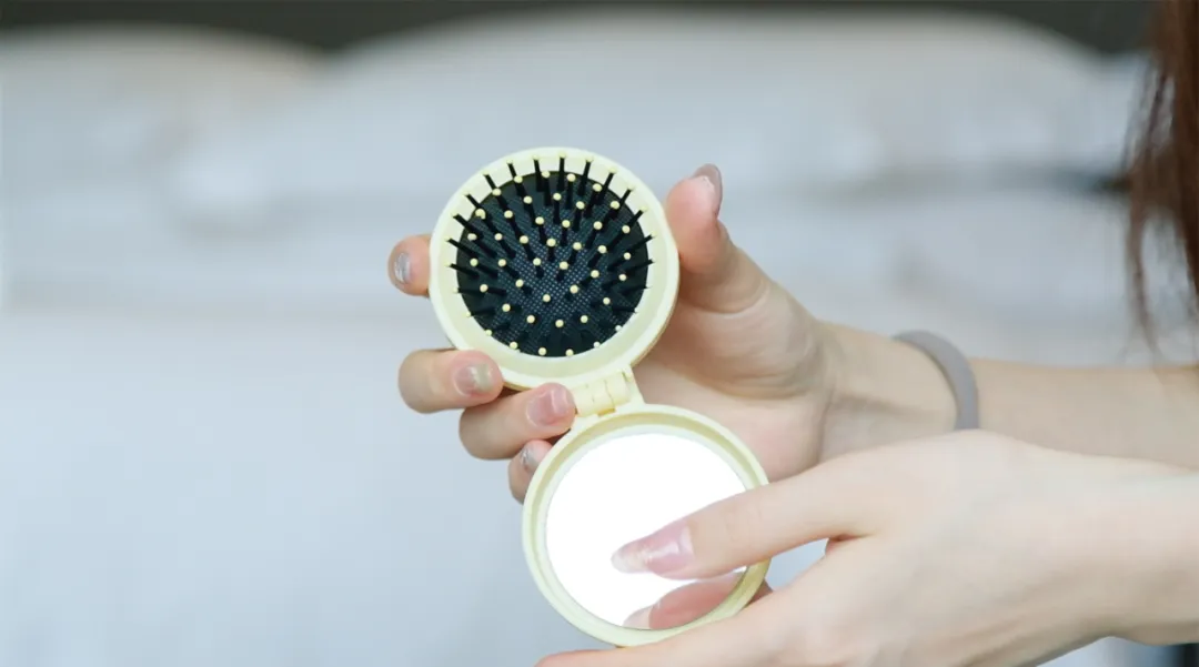 掌心大小藏着小镜子+气垫梳,发缝隐形术+补妆神器二合一,出门在外也能随时维持氛围感发型。▼