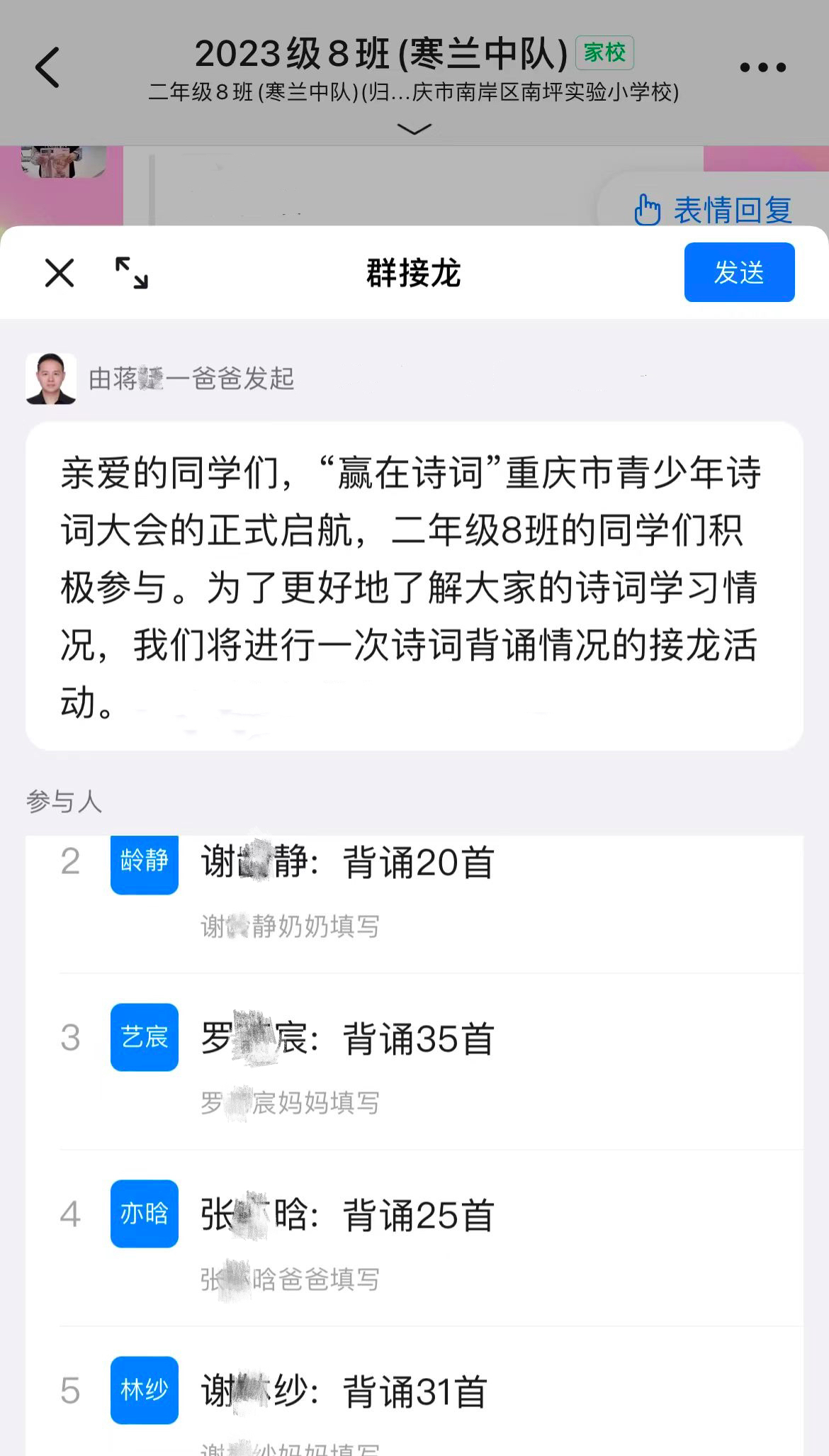 二年级8班的家委会自发组织起诗词背诵接龙活动,通过班级圈相互提醒,共同助力孩子们的诗词学习。