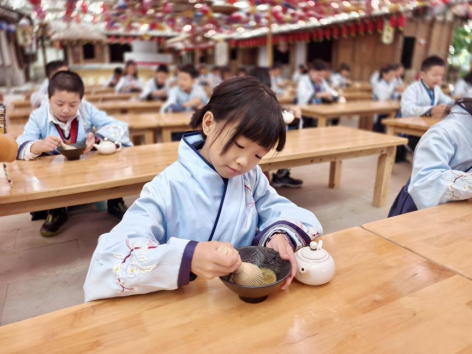 垫江的第一站,小记者们抵达了风景如画的垫江牡丹樱花世界。在这里,一场“时空穿越”正等待着他们。换上飘逸的宋制汉服,孩子们仿佛瞬间化身为风雅的宋代文人墨客。在专业老师的指导下,他们沉浸于宋代“四艺”之首——点茶的雅致世界中,手持茶筅耐心“击拂”,直至茶汤泛起细腻的乳白色沫饽。这不仅是一次新奇的手工体验,更是一次对“和、静、雅”传统茶道精神的切身感悟。