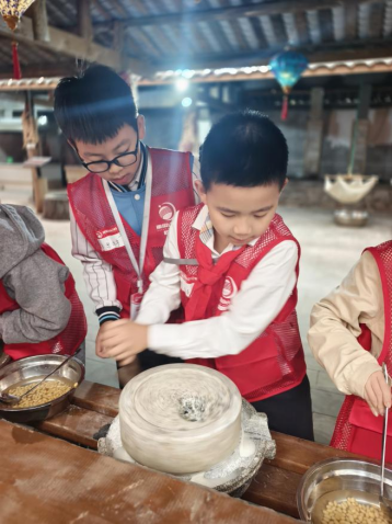 紧接着,场馆内豆香四溢,本次垫江专访的核心体验——“垫江石磨豆花非遗制作”正式开启。小记者们亲手转动沉甸甸的石磨,看着颗颗饱满的黄豆在研磨中化作醇厚的浆液。他们严格遵循古法,学习掌控温浆与点兑石膏的火候,亲眼见证豆浆如何神奇地凝结成绵密柔嫩的豆花。最后,再用本地特色的各种调料调制独家蘸水。从磨浆到品尝,每一个环节都充满了探索的乐趣,舌尖上的匠心在亲手实践中变得具体而深刻。