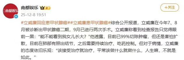 近日,明星立威廉回应他患甲状腺癌,并已进行两次手术的新闻,引发了不少人的关注。据透露,目前他已99%切除肿瘤,但还是害怕扩散,目前在肺部有发现结节,之后需要持续治疗、吃药控制。对于甲状腺癌,不少人认为是“懒癌”,病情不凶险也不会进展,但其实并非如此。那该如何避免甲状腺癌复发转移呢?
