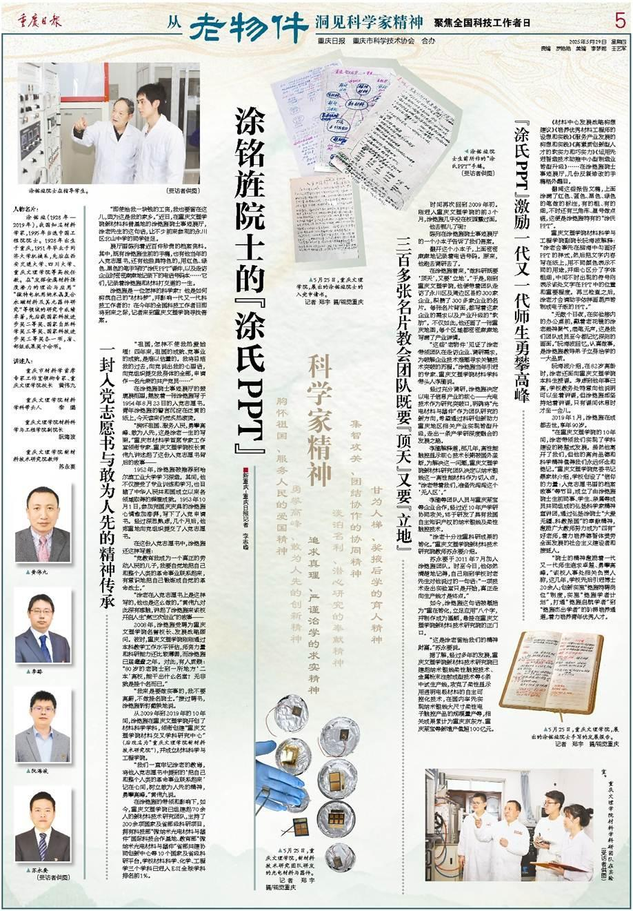 “这些‘老物件’见证了涂老带领团队在走访企业、调研需求,为破解企业技术难题寻求关键技术突破的历程。”涂铭旌当年引进的专家、重庆文理学院材料学科带头人李璐说。