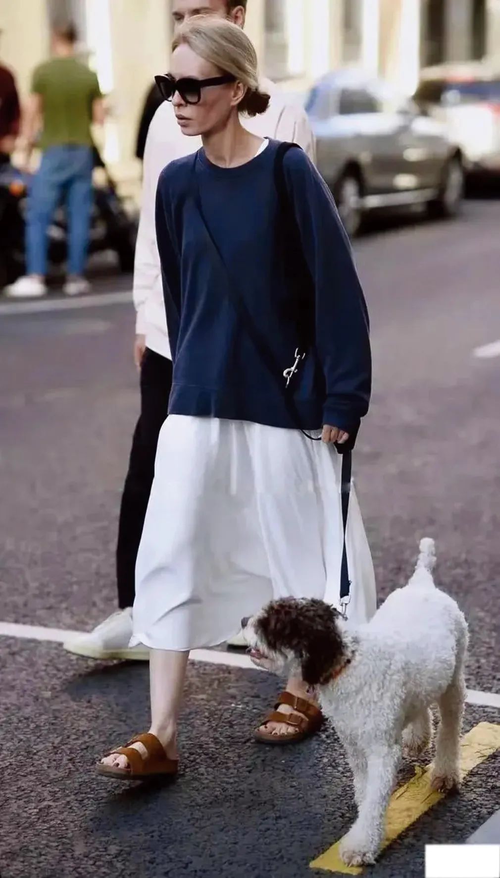 暮色蓝与白色搭配展现出清新与纯净,柔和中带有一丝高级感,适合日常出街,为整体造型增添一抹轻盈与灵动。