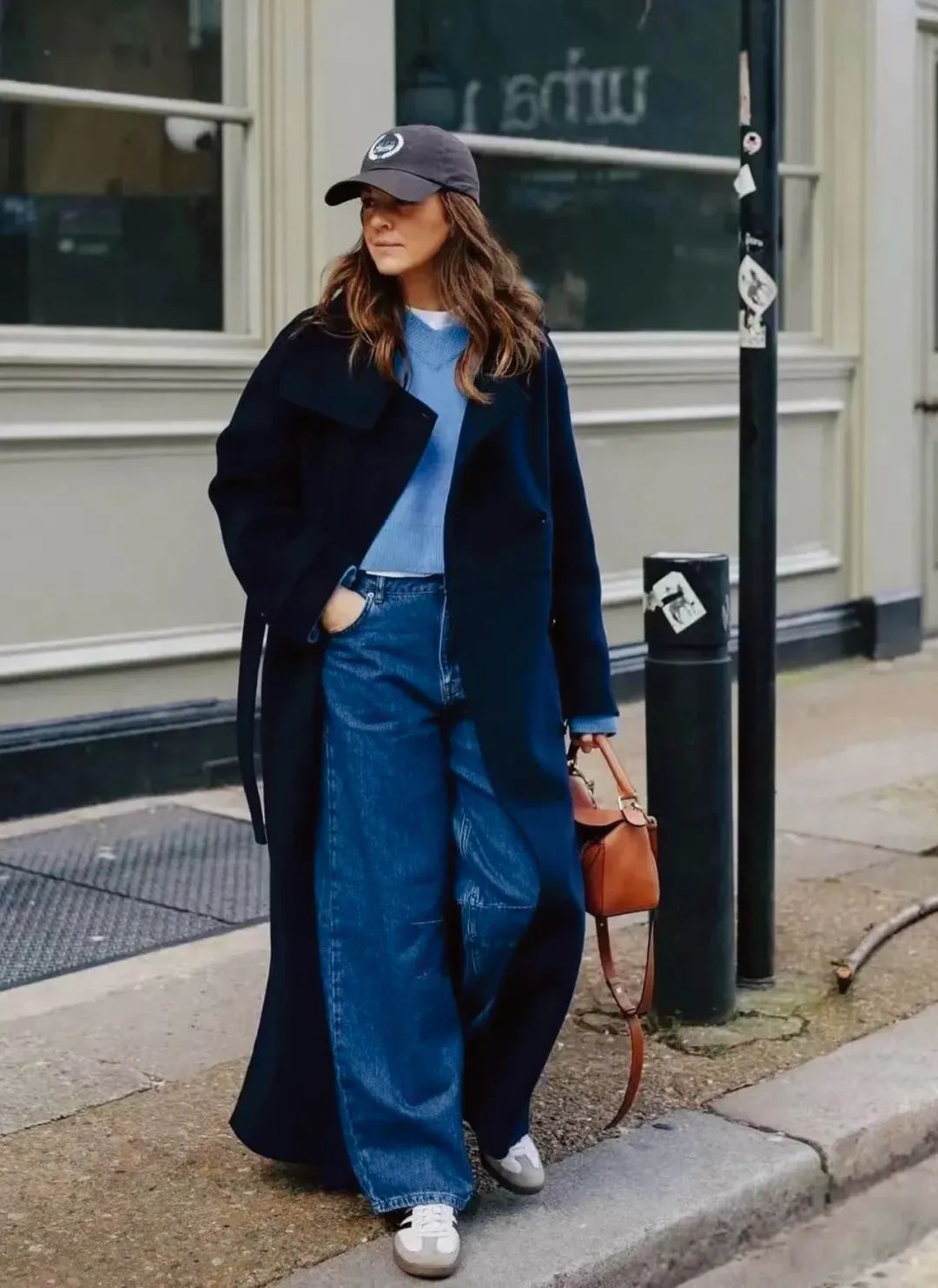 穿上一件暮色蓝大衣搭配同色系的内搭,打造简约的高级感,颇显沉稳大气。深浅不同的蓝呈现出来的层次感和谐又清爽,里面还可以叠穿白色T恤衫,下身再穿一条蓝牛仔阔腿裤。