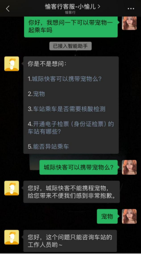 新女报向渝客行客服咨询城际快车是否可以携带宠物时,得到的答复是“具体需咨询相关车站”。